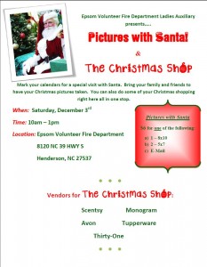Epsom Volunteer Fire Department Ladies Auxilliary Hosts Christmas Event Submitted Article November 30, 2011 Things To Do Epsom Volunteer Fire Department Ladies Auxiliary presents….. Pictures with Santa & The Christmas Shop. This Saturday, December 3rd from 10am-1pm at the Epsom Volunteer Fire Department CategoriesThings To Do
