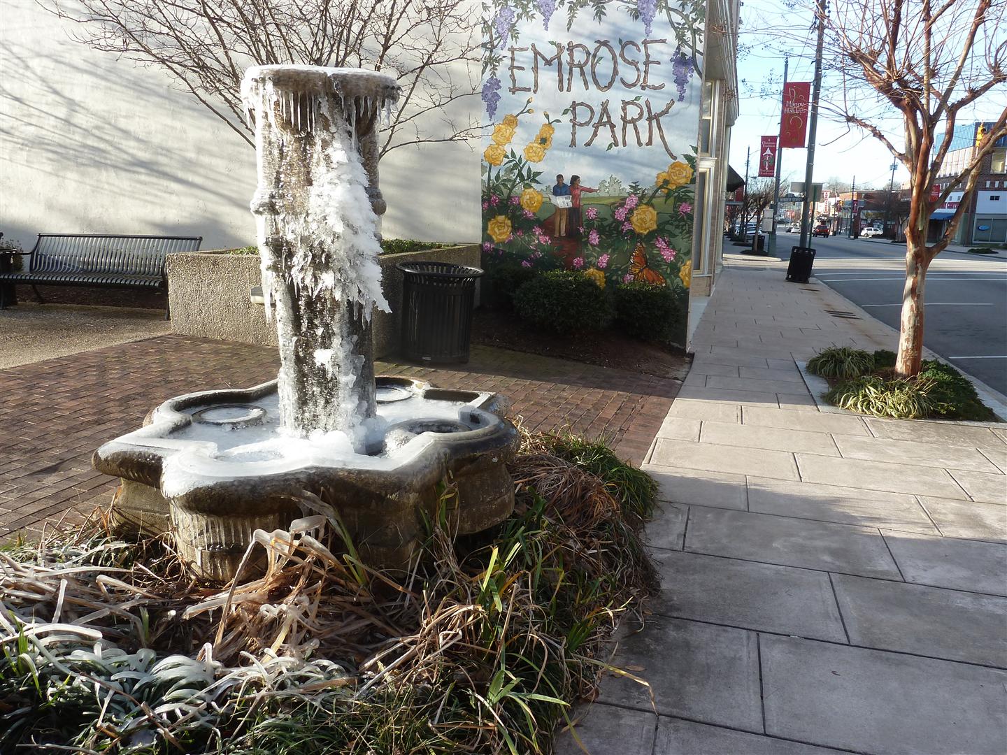 Today won’t be so bad, with a projected high of around 52, but yesterday… cold. A few steps away from our office sits Emrose Park, an area between the downtown buildings that even on 20 degree weather days fills with workers from the local businesses taking a break. Yesterday, the focal piece running water fountain was actually frozen with a pretty cool design. Check our pics.