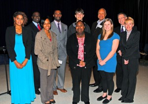 In front, from left, students Rachel Williams (the second-place winner in the essay contest), Etasha Cheek (third place), Dyvoniek Burwell (honorable mention), Liana Parsons (fourth place) and Nicolette Lee (first place); in back, from left, Ken Smith of WRAL News (judge), Fred Shropshire of WTVD News (master of ceremonies), student Tyler Carwell (honorable mention), Leo Kelly, Jr. (judge) and Daily Dispatch publisher James Edwards (judge). Not pictured: students Zachary Barrows and Denisha Bullock (both honorable mentions). (VGCC photo)