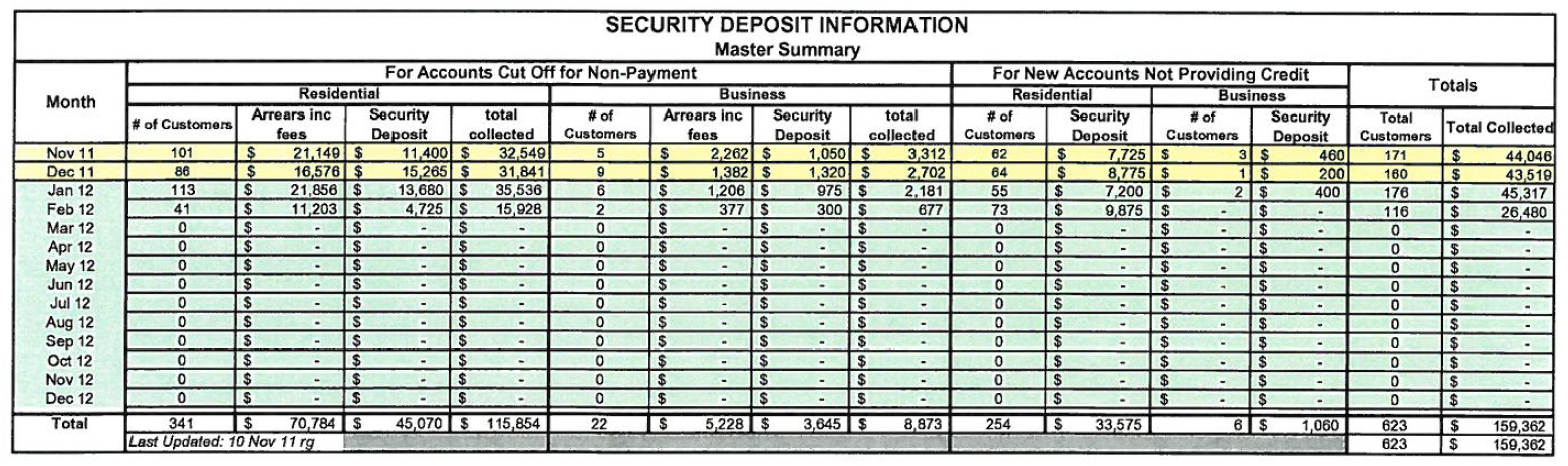 Phase 1 implementation of requiring customers to establish security deposits went relatively well. For the period 1 November 2011 through 10 February 2012 a total of 363 existing customers and 260 new customers were required to establish security deposits. The existing customer group for this period of time were for accounts terminated for non-payment of two months’ billing in arrears.