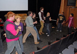 VGCC students rehearse for the play, “Rumors.” From left, partiers played by Spencer Nunn, Rachel Pottern, Patrick Miracle, Joy Chalmers, Nick Henderson and Jennie Robinson are interrupted by police officers played by Jerome Bulluck and Shaneisha Eaton. (VGCC photo)