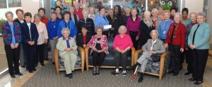 A group of past and present volunteers gather in front of the Guild Gift Gallery at Maria Parham Medical Center to celebrate the creation of the new VGCC scholarship. Seated in the center are, from left, Gean Bobbitt and Ann Rose Allen, the current and former coordinators of the gift shop, respectively. Standing behind them in the center, Guild president Anne Bunch presents contributions to VGCC Vice President of Institutional Advancement and Endowment Fund director Jo Anna Jones (in back) and VGCC President Dr. Stelfanie Williams. (VGCC Photo)
