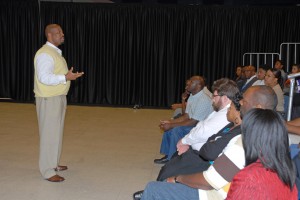 After an introduction by VGCC student Curtis Jefferys of Henderson, Lewis said that his goal and his destiny are to “refute the notion of impossibility.” To explain what that meant, he had to share his improbable life story. Growing up in Durham, Lewis endured years of physical abuse at the hands of his father. Homeless at age 16, he got into “some trouble” but never stopped going to school. After graduating from high school at age 17, Lewis enlisted in the Marine Corps, but his troubles continued and he found himself behind bars. His message to young men: there is “nothing manly about going to prison.” Lewis recalled that his fellow prisoners became his first “professors” by giving him books to read. “They were actually angels who prepared me to become the professor I am today,” Lewis said.