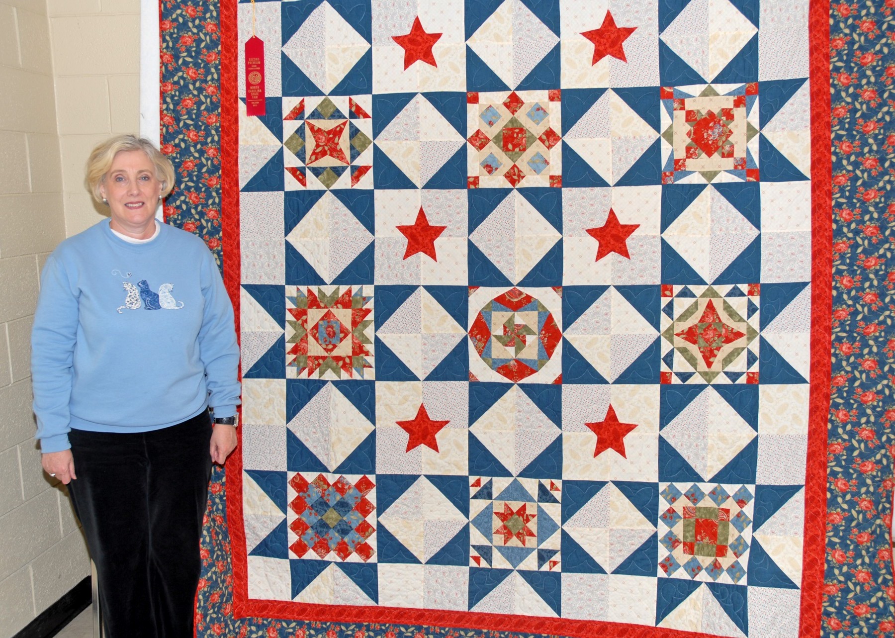 Patiky, one of Stocks’s students, said she has been quilting since 2003. Her entry, a red-white-and-blue-based quilt called “Glory,” also won second place at the North Carolina State Fair in 2011. “It was a kit from the online shop called Grandma’s Attic,” Patiky said of the quilt. “All the sewing in this quilt is done by hand, the piecing of the blocks and the quilting, which is my own design. It was quilted in a 14-inch hoop in my lap, with my three cats assisting and approving.”