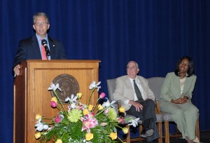 Dr. Scott Ralls, the president of the North Carolina Community College System (at podium, left), makes remarks during a reception in honor of VGCC President Dr. Stelfanie Williams as, seated from left, college Board of Trustees chairman Donald C. Seifert, Sr. and Williams listen. (VGCC photo)