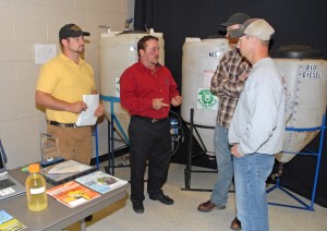 From left, Earth Day exhibitors John Pendergrass and Jody Hastings of Future Fuels Unlimited talk to VGCC Air Conditioning, Heating and Refrigeration Technology students Robert Bell of Oxford and Chris Franklin of Creedmoor about their biodiesel business. (VGCC photo)