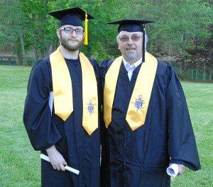 From left, Nick Whaley and Ron Moskal, on VGCC’s Main Campus shortly after they both walked across the stage at graduation exercises on May 11, 2012. Whaley graduated with an Associate in Arts, Moskal with a degree in Bioprocess Technology. (VGCC photo)