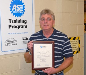VGCC Automotive Systems Technology program head Fred Brewer holds the accreditation plaque his program recently received from the National Automotive Technicians Education Foundation (NATEF) and The National Institute for Automotive Service Excellence (ASE). (VGCC Photo)
