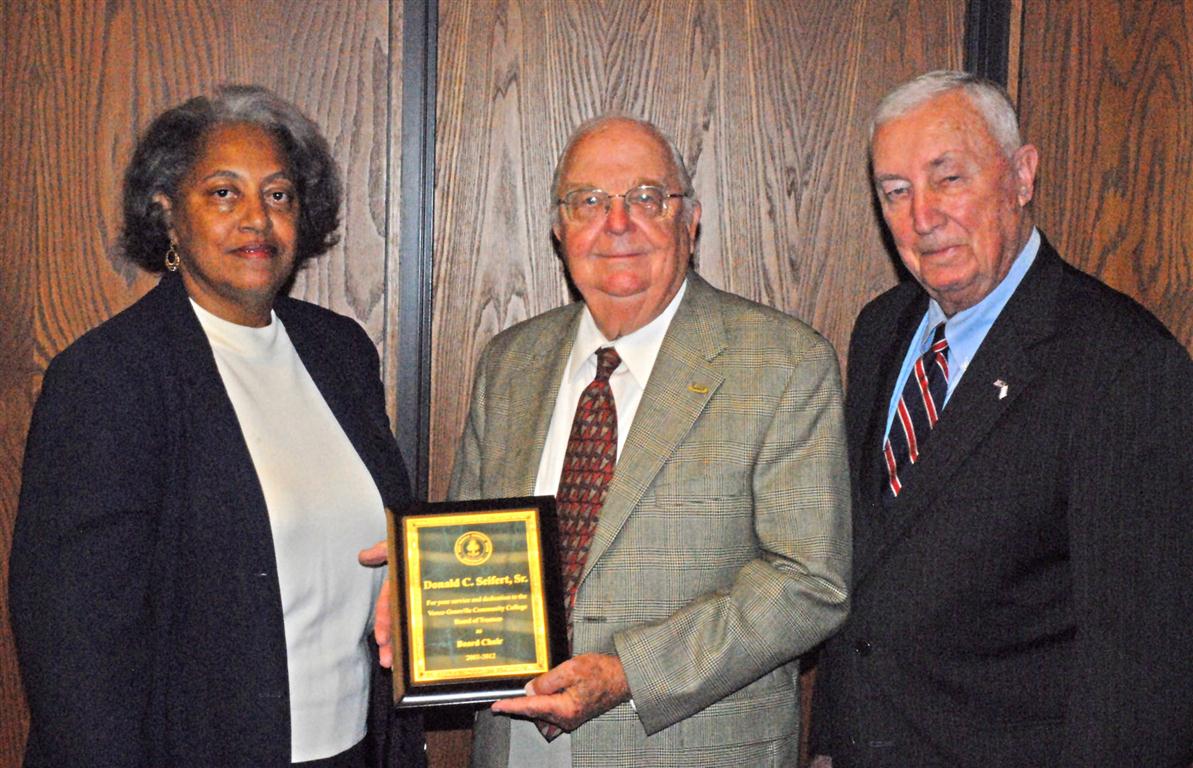 HONORED — The Board of Trustees honored its former chair, Donald C. Seifert, Sr. of Henderson, with a plaque thanking him for his service to the Board. Seifert had served as Board chair from 2003 through 2012 and continues to serve as a trustee. Pictured, from left: current Chair Deborah F. Brown of Henderson, Seifert, and Vice-Chair Stanley H. Fox of Oxford. (VGCC photo)