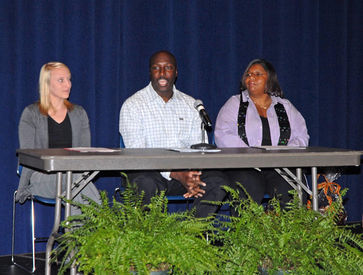 VGCC student panelists (from left) Jennie Robinson, Curtis Jefferys and Felicia Sanders-Gupton address counselors and administrators from local middle and high schools at the Oct. 18 forum in the VGCC Civic Center. (VGCC Photo)