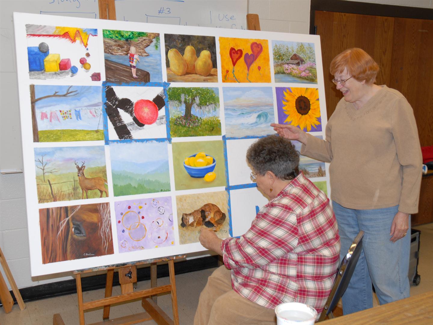 Students in two Personal Enrichment Art classes at Vance-Granville Community College recently completed work on a mural that will decorate the Granville County Senior Center. Twelve students in a day class and nine others in a night class, both taught by longtime instructor Lelia Brigham, have each contributed to the four-by-six-foot quilt-like mural. “It’s one of the most original ‘quilts’ I’ve ever seen,” Brigham said. “Each artist chose his or her own subject, design and style, so it’s very colorful and allows for each student’s personality to come through.” All paintings are acrylic, with a mix of still life and landscapes, including a tobacco barn that evokes the Granville-area countryside. A depiction of a clothesline behind a house and a close-up of a horse’s eye can also be spotted among the 20 rectangles that make up the mural.
