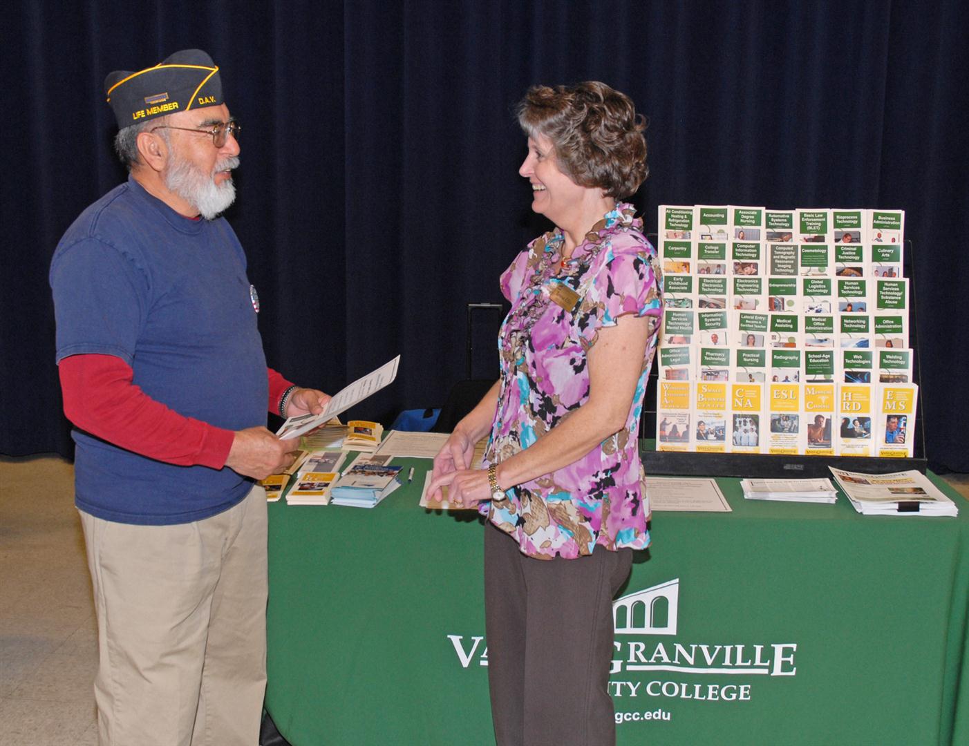 Around 30 businesses and organizations were on hand to provide resources, receive resumes and talk with potential future employees. VGCC staff members were also on hand to offer information on the college’s various job training programs that can help veterans obtain skills and preparation for employment. Pictured above, from left: Robert Garcia of Oxford, a U.S. Air Force veteran and commander of Disabled American Veterans Chapter 97, talks with Teresa Ellis of VGCC’s Human Resources Development department. Garcia is a graduate of VGCC’s Associate Degree Nursing program and was considering developing new skills now that he has retired from nursing.