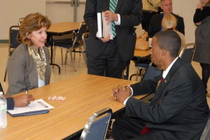 From left, U.S. Sen. Kay Hagan talks with VGCC student Tory Young of Oxford about education issues during the senator’s “Conversations with Kay” event at VGCC’s Franklin County Campus. Young is one of the college’s ambassadors and is enrolled in the Accounting and College Transfer programs. (VGCC photo)