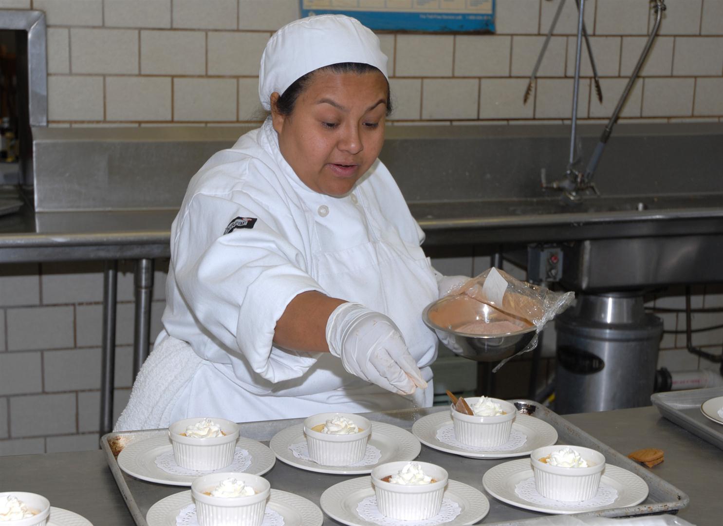 VGCC Culinary Arts student Leticia Mendez prepares a dessert for patrons at The Vanguard Café. (VGCC Photo)