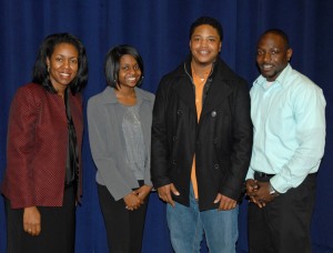 From left, Dr. Stelfanie Williams, the president of VGCC, congratulates the first, second and third-place winners of the essay contest: students Terrica Cooper, Justin Davis and Jamill Belton, respectively. Not pictured: student Amber Maddox (honorable mention). (VGCC photo)