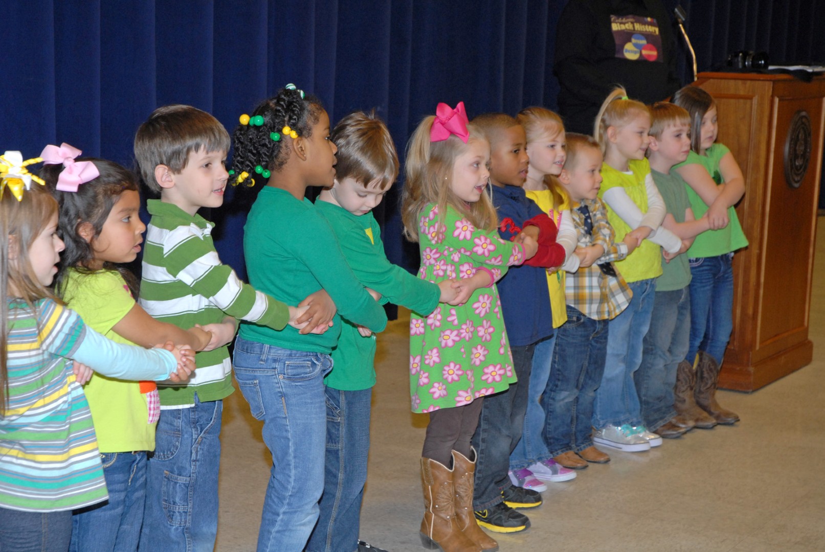Children from the VGCC Main Campus Child Care Center hold hands while singing a song on diversity on Feb. 27. (VGCC photo)