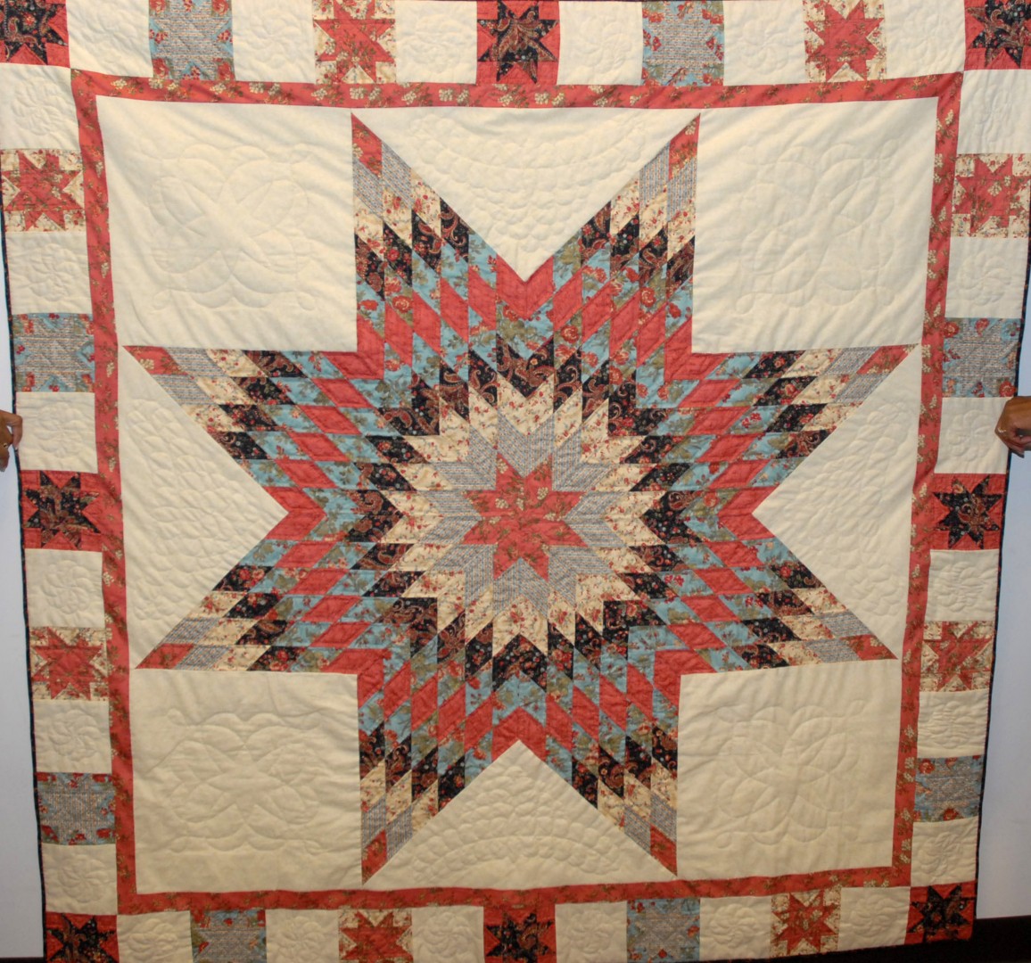 Thurber, one of Stocks’s students, said that even though she is the daughter and granddaughter of quilters, it took her many years to take up the craft. “After attending several semesters of quilting at Vance-Granville Community College, I decided I needed a challenge,” Thurber said, of her selected quilt, “Star of Bethlehem,” which was inspired by a picture in her VGCC class workbook. “After many hours of selecting fabrics, piecing and quilting, this is the result.”