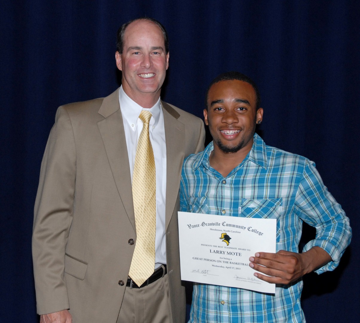 From left, VGCC men’s basketball Coach Mike Rotolo presents an award to player Larry Mote. (VGCC photo)