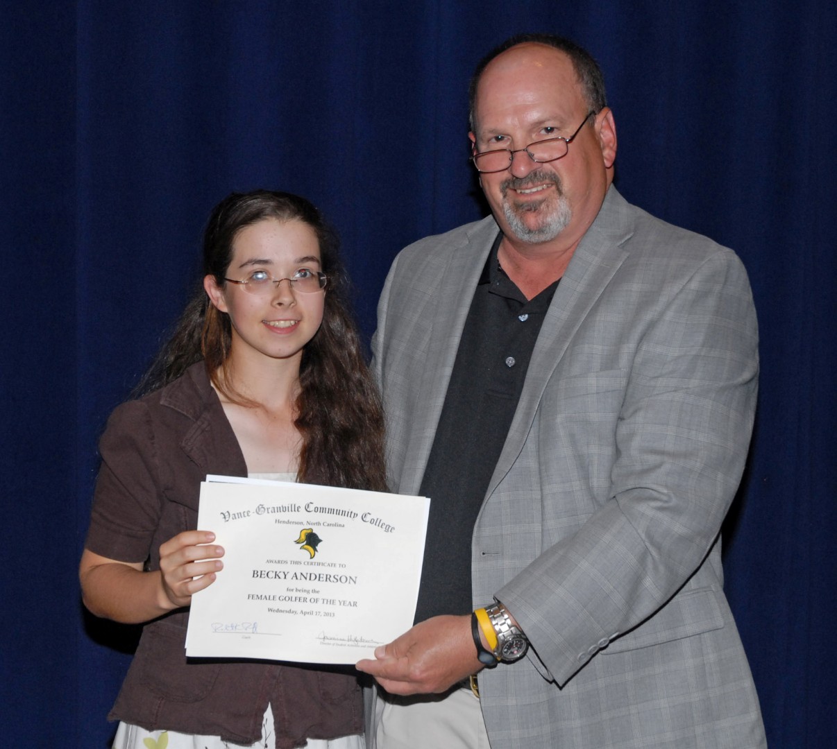 Golf coach Bobby Paff presented the Male Golfer of The Year award to Jacob Rinker of Creedmoor, and the Female Golfer of The Year award to Becky Anderson of Henderson.