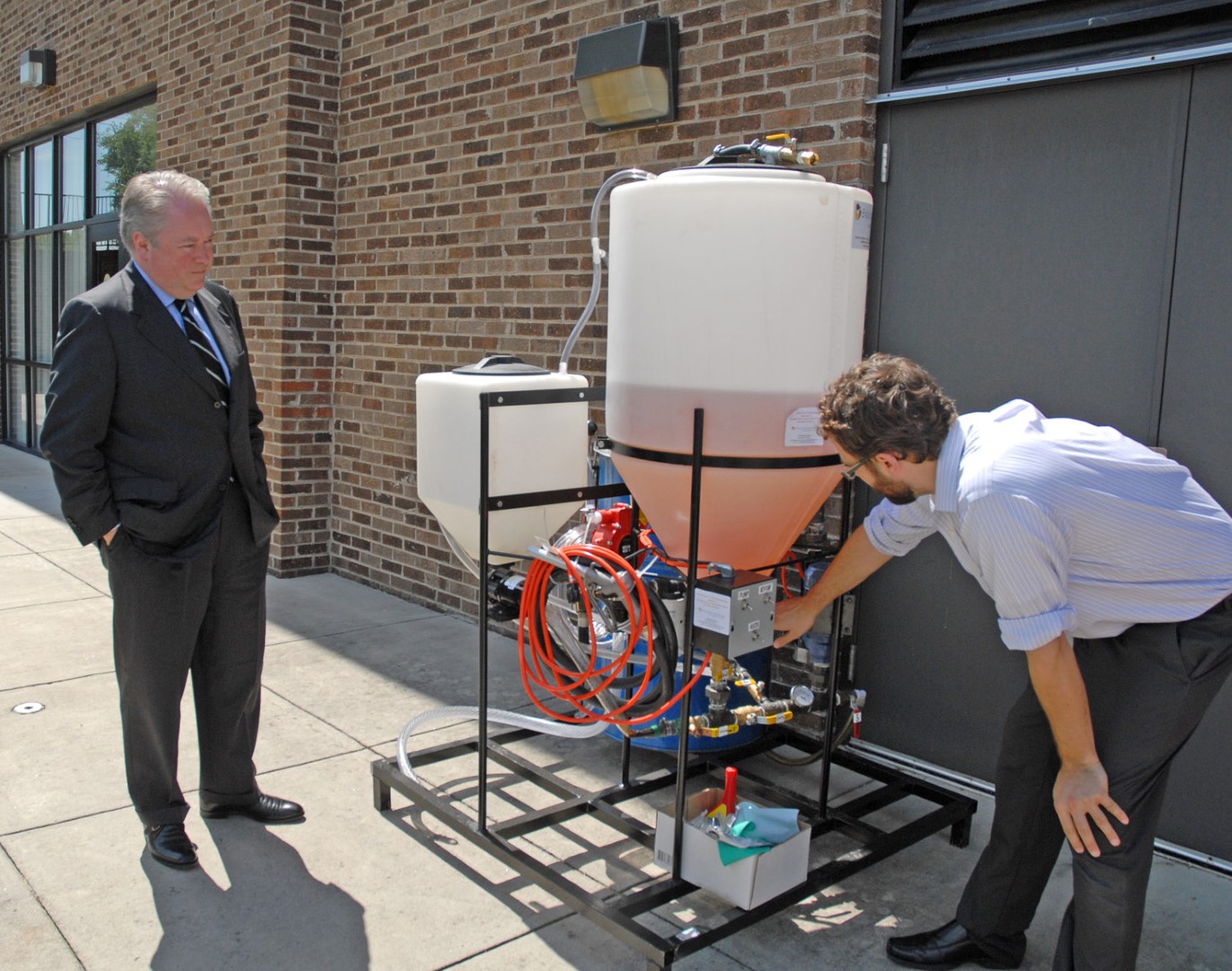 Dr. Danny Monroe (right), head of the VGCC Bioprocess Technology program, describes how his program’s biodiesel production equipment works to U.S. Rep. George Holding (left) during the congressman’s campus tour. (VGCC photo)