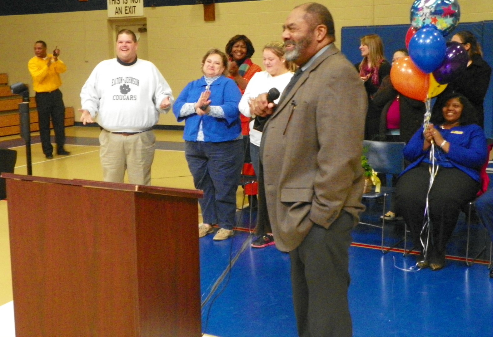The 700 students at Eaton-Johnson Middle School joined their teachers and other school staff members, as well as support personnel from the Administrative Services Center, in a “surprise” assembly Wednesday afternoon to announce that Dr. Larry Webb, principal of Eaton-Johnson, has been selected as the Region 3 Principal of the Year for the 2013-2014 school year.
