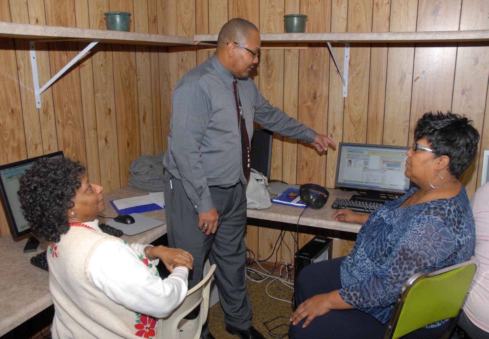 Students Magnolia Jackson (left) and Alice Burroughs (right), both of Manson, listen as VGCC instructor Donald Evans (center) explains a computer skills test at St. Delight Holy Church. (VGCC photo)