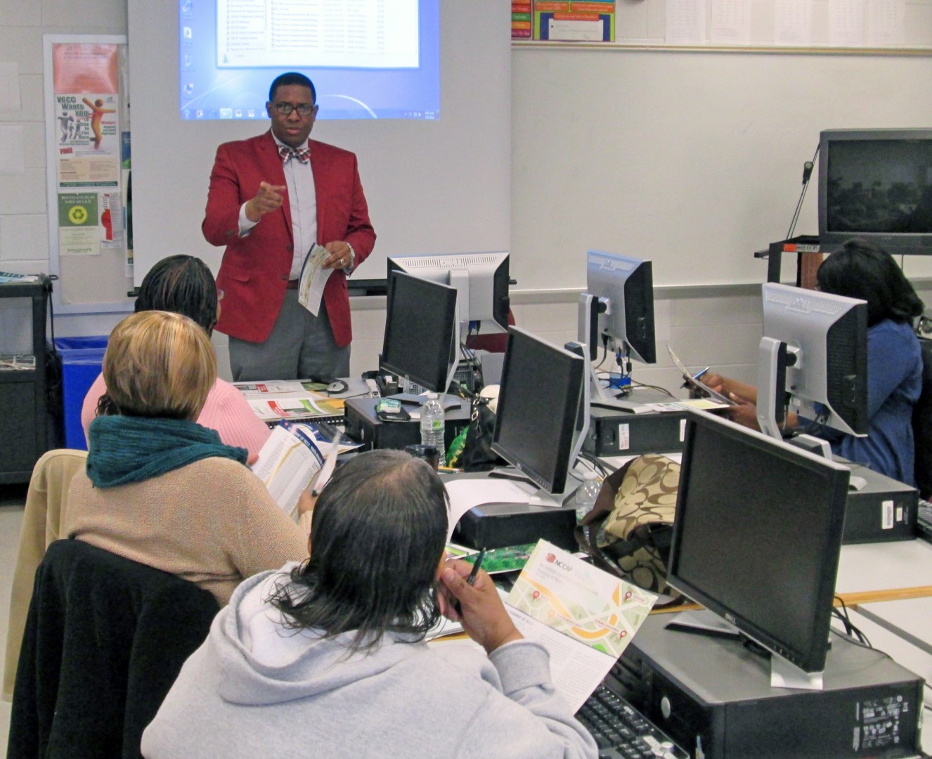 Del Ruff (standing), director of the North Carolina Center for Afterschool Programs, speaks at VGCC to participants in afterschool professional development training.
