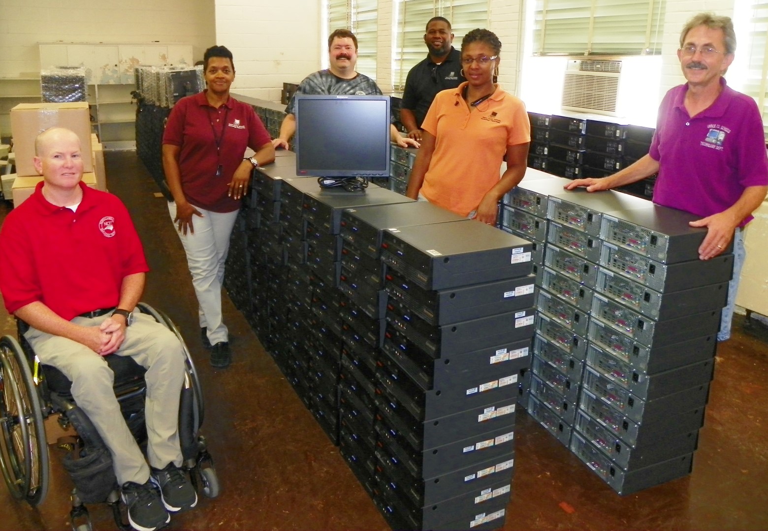 Six technicians with the Technology Department are shown in the accompanying photo among the 877 new computers and 58 new flat-screen monitors that were purchased recently with federal funds through the school system’s Title I program.