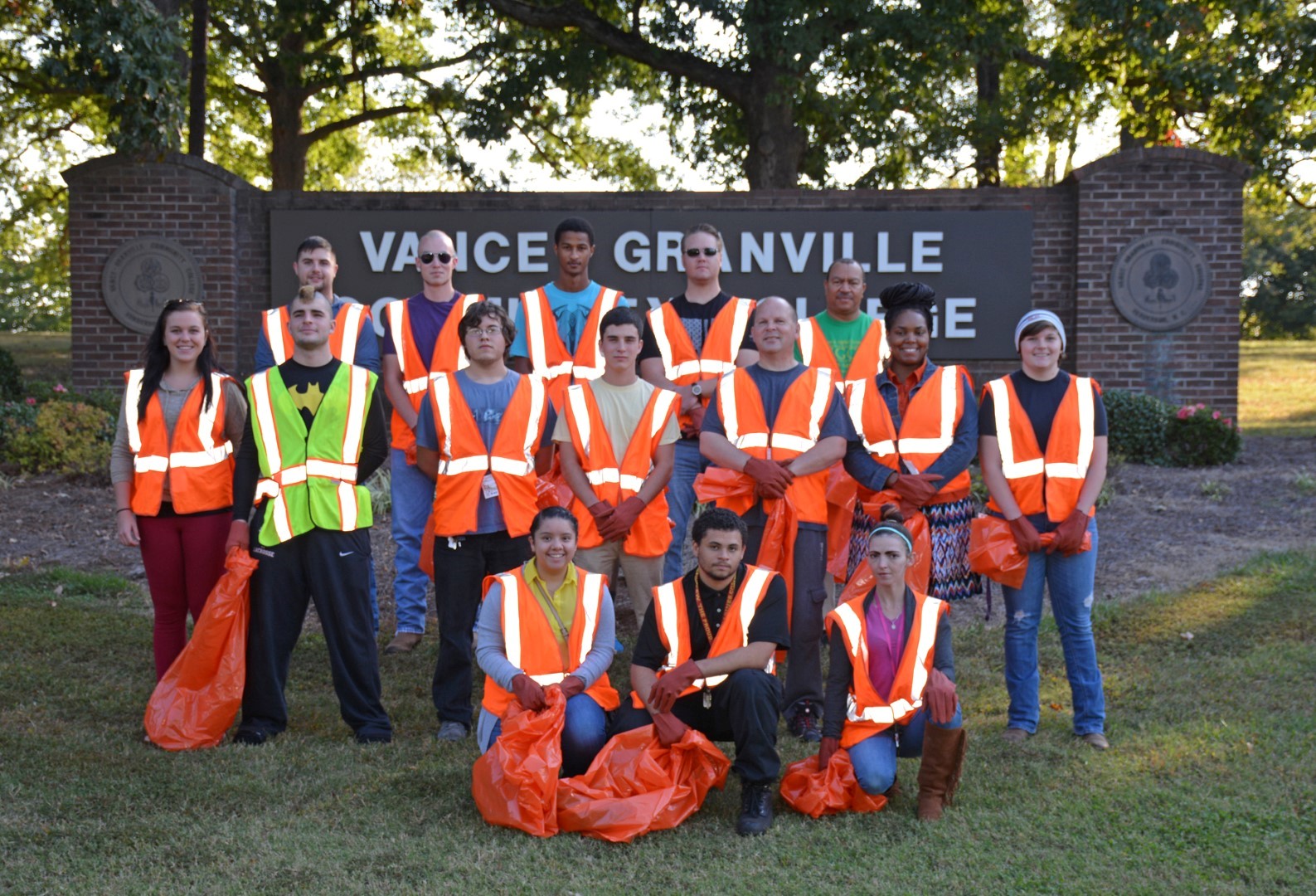 VGCC Criminal Justice Club members take a break during their clean-up along Poplar Creek Road in front of the college’s Main Campus. Kneeling in front, from left, are Janet Rodriguez Morales of Henderson, William Douglas of Henderson and Stacie Bowes of Henderson; standing in middle row, from left, are Jordan Dickerson of Oxford, Joseph Toto of Oxford, Benjamin Layton of Kittrell, Marshall Keeton of Butner, Paul Grenier of Oxford, Jasmine Allen of Warrenton and Karly Blue of Stem; standing in back, from left, are Nicolas Parkstone of Stem, William Nutt of Henderson, Isaiah Blanchett of Monroe, James Hann of Creedmoor and instructor/club advisor Tony Clark. (VGCC photo)