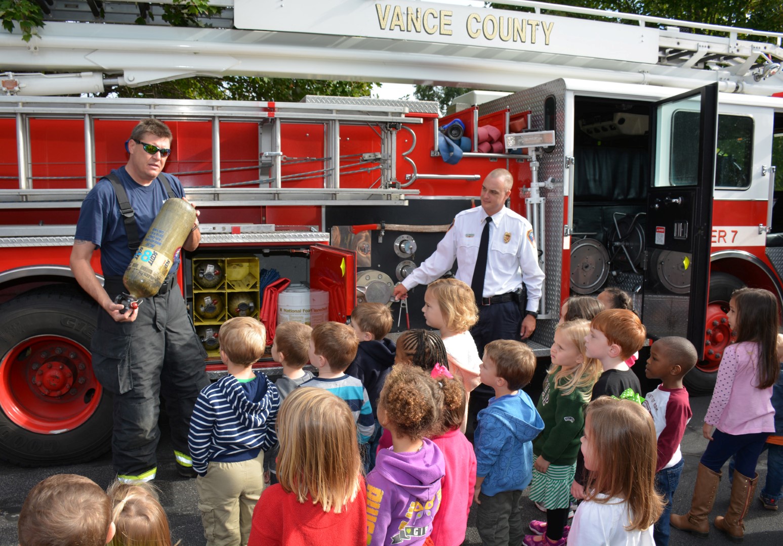 Children enrolled in the Child Care Center on Vance-Granville Community College’s Main Campus recently learned about fire safety and fire trucks as part of October’s observance as Fire Prevention Month. Special guests at the center in October were, pictured above (from left), Captain Bryant Williams of Vance County Emergency Services and Battalion Chief Tim Twisdale of the Henderson Fire Department. The firefighters discussed the “stop, drop and roll” technique and what to do in case of a fire at home. They also talked with students about the importance of smoke detectors and how the firefighter’s uniform works, among other topics.
