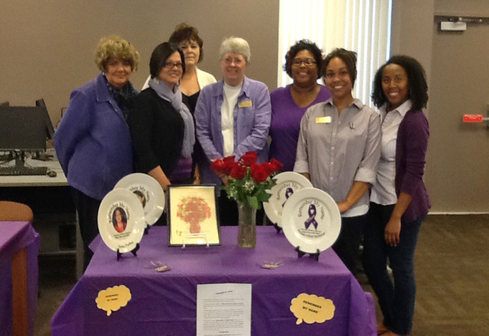 Participants in the domestic violence awareness program at VGCC’s South Campus included, from left, South Campus Dean Cecilia Wheeler, survivor Amanda Bennett, Families Living Violence Free executive director Pam Hester, counselor Phyllis Thomas, library/open lab technician Roberta Freeman, financial aid assistant Sonya Richardson, and Developmental Math instructor Jillian Davis. Others involved in the event but not pictured were receptionist Diane Blalock and administrative assistant Geraldine Cash. They are pictured standing behind a display created by Freeman that features plates in memory of domestic violence victims. Each plate bears the message, “Domestic violence leaves an empty place at the table.”