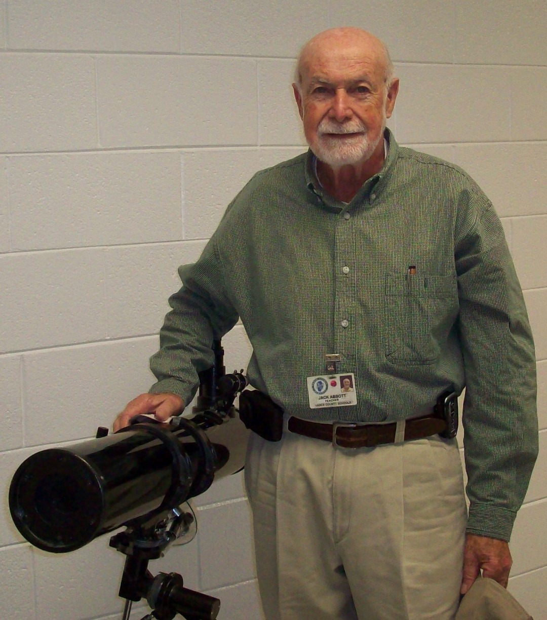 Jack Abbott of Henderson and a volunteer in Vance County Schools, has donated a telescope to the STEM Early High School. Abbott is shown in the accompanying photo with the telescope when he came to the school to make the donation. The telescope will be used extensively in scientific studies by the students at the school in grades 6-8. Principal Rey Horner, along with his staff and students, were delighted to receive the very generous donation.