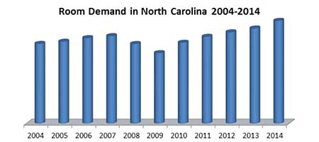 For the third year in a row, North Carolina room demand for accommodations was at an all-time high. Recent data released by Smith Travel Research (STR) shows that 2014 room demand was up more than 5 percent from 2013 with nearly 33 million room nights sold in the state. In the last ten years, room demand has grown more than 18 percent. Nationally, room demand was up 4.5 percent in 2014; in the South Atlantic region, demand increased 5.4 percent. Room demand is defined as the number of rooms sold, excluding complimentary rooms. |