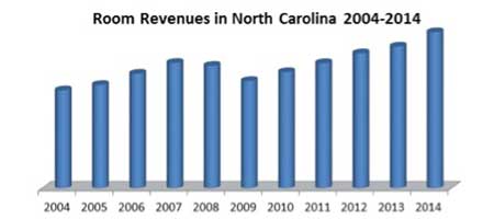 | North Carolina hotel/motel room revenues were up 10 percent in 2014 from 2013, reaching nearly $3 billion and topping the previous high set just last year. Statewide room revenues have increased 59 percent in the last decade and 45 percent in the last five years. This is due to both an increase in demand and ADR throughout the state. Nationally, room revenues were up 9.2 percent; in the South Atlantic states, room revenues increased 9.9 percent from 2013 to 2014. |