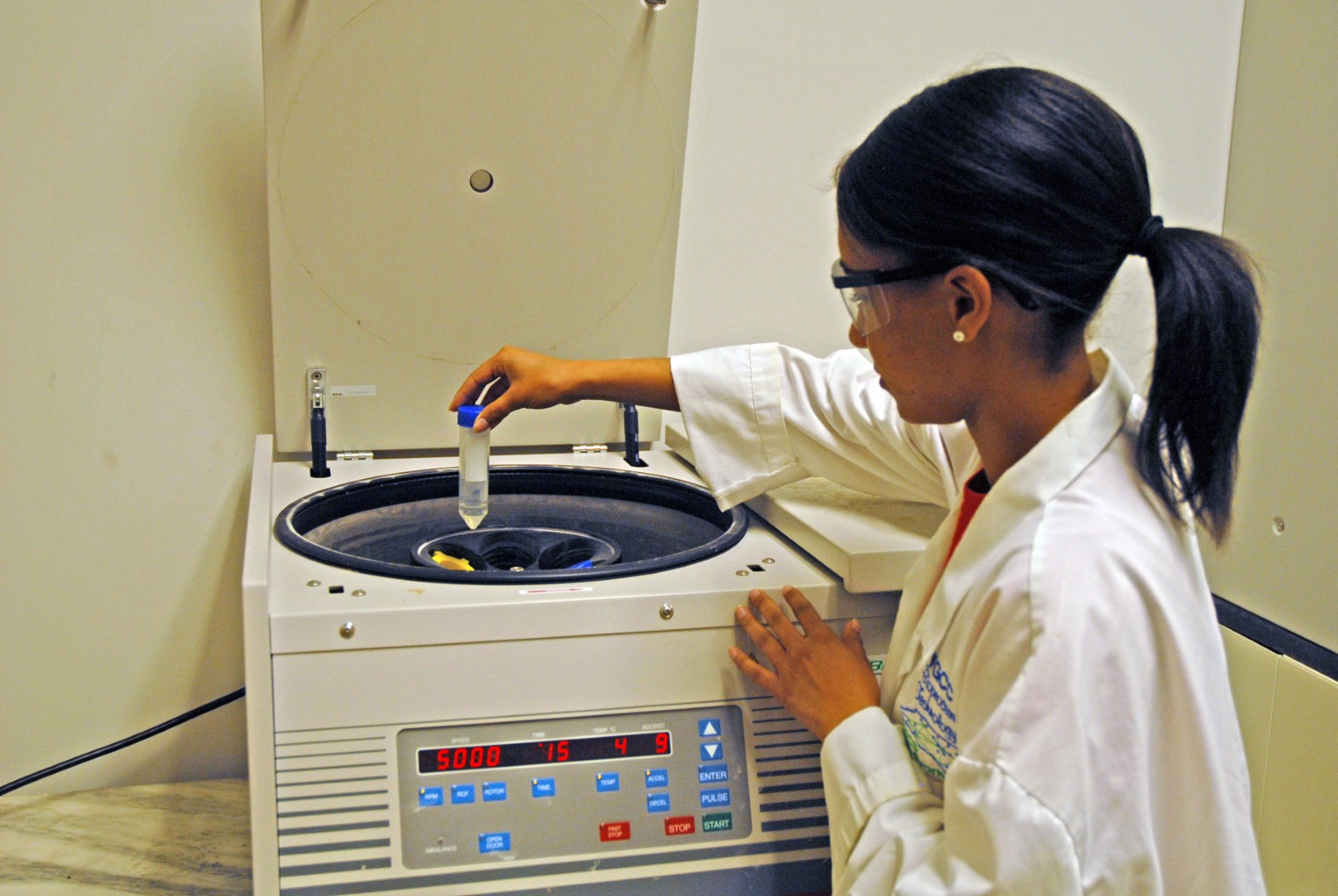J.F. Webb School of Health and Life Sciences student Armani Grillo places a solution into a centrifuge during the 2014 VGCC Biotech Workshop. (VGCC photo)