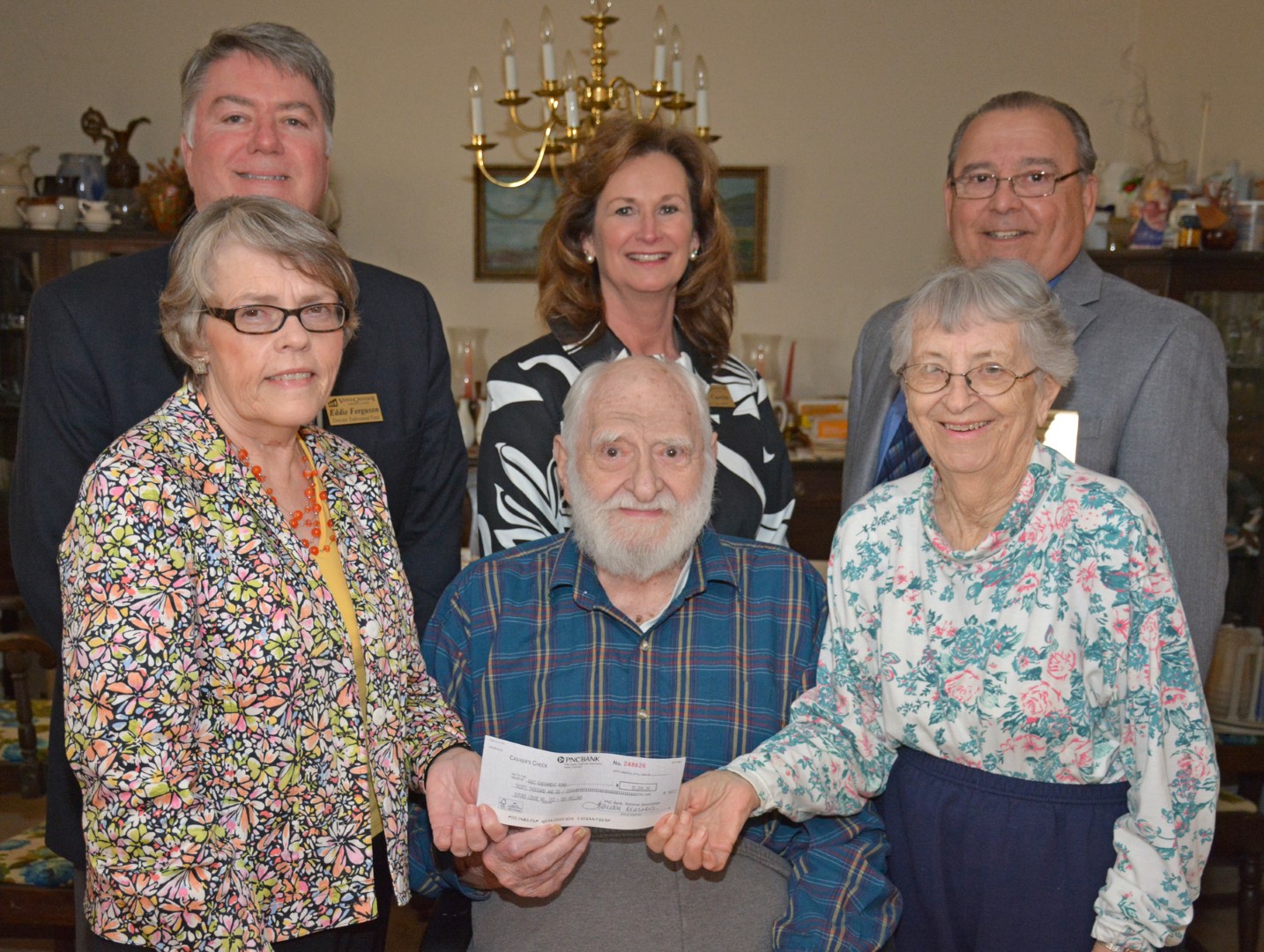 Pictured at the Hunt home in Creedmoor are, in front, from left, Melinda Brooks (representing her late husband, David Brooks), Robert Hunt and Judy Hunt; in back, from left, VGCC Endowment director Eddie Ferguson, Endowment specialist Kay Currin and Vincent Doria of Wake Forest, the deputy grand master of the Independent Order of Odd Fellows Grand Lodge of North Carolina. (VGCC photo)