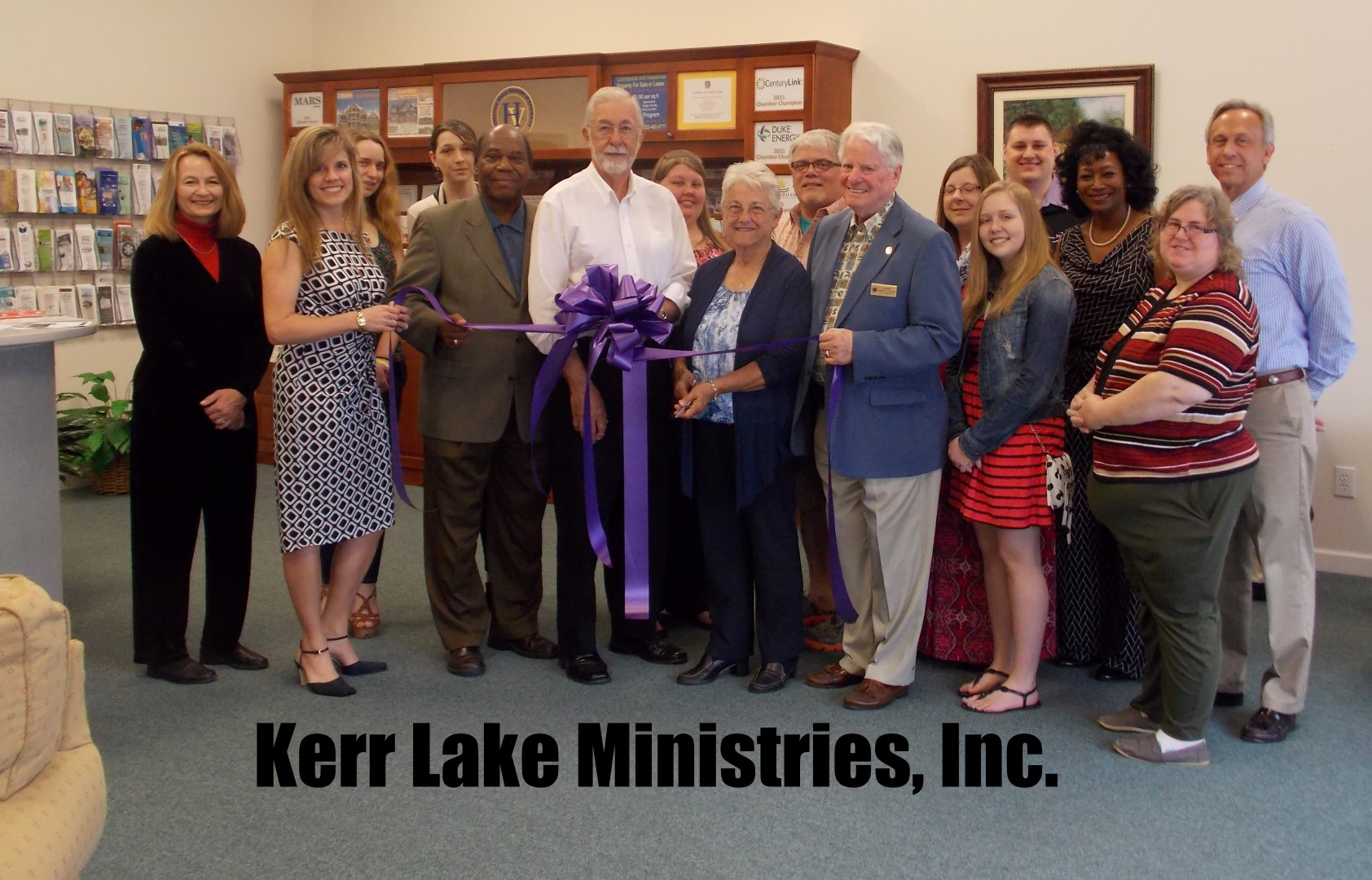 Shown at the Henderson-Vance Chamber of Commerce ribbon cutting for Kerr Lake Ministries, Inc. are, Sandy Poythress, Kerr Lake Ministries; HVCC Board Chair Tonya Evans, Duke Energy; Archie Taylor, Vance County Commissioners Chairperson; Clark Simpson and Susan Sears, Kerr Lake Ministries, Inc.; Mayor Pete O’Geary; Joyce Doughty, Tots ‘N More Consignment Boutique; Sierra and Miranda Yount; Brittany Hedgepeth; Bobby Williams; Christy Buchanan; Chamber Ambassador Kevin Bullock, WIZS 1450 AM Radio; Chamber Ambassador Joan Robinson, Kittrell Job Corps Center; HVCC President John Barnes; and other friends of Kerr Lake Ministries, Inc. Not Pictured: HVCC, Office Manager Melanie Mann; HVCC Director of Membership Services, Annette Roberson; and Jenny Hester, PRIM Development and Rentals.