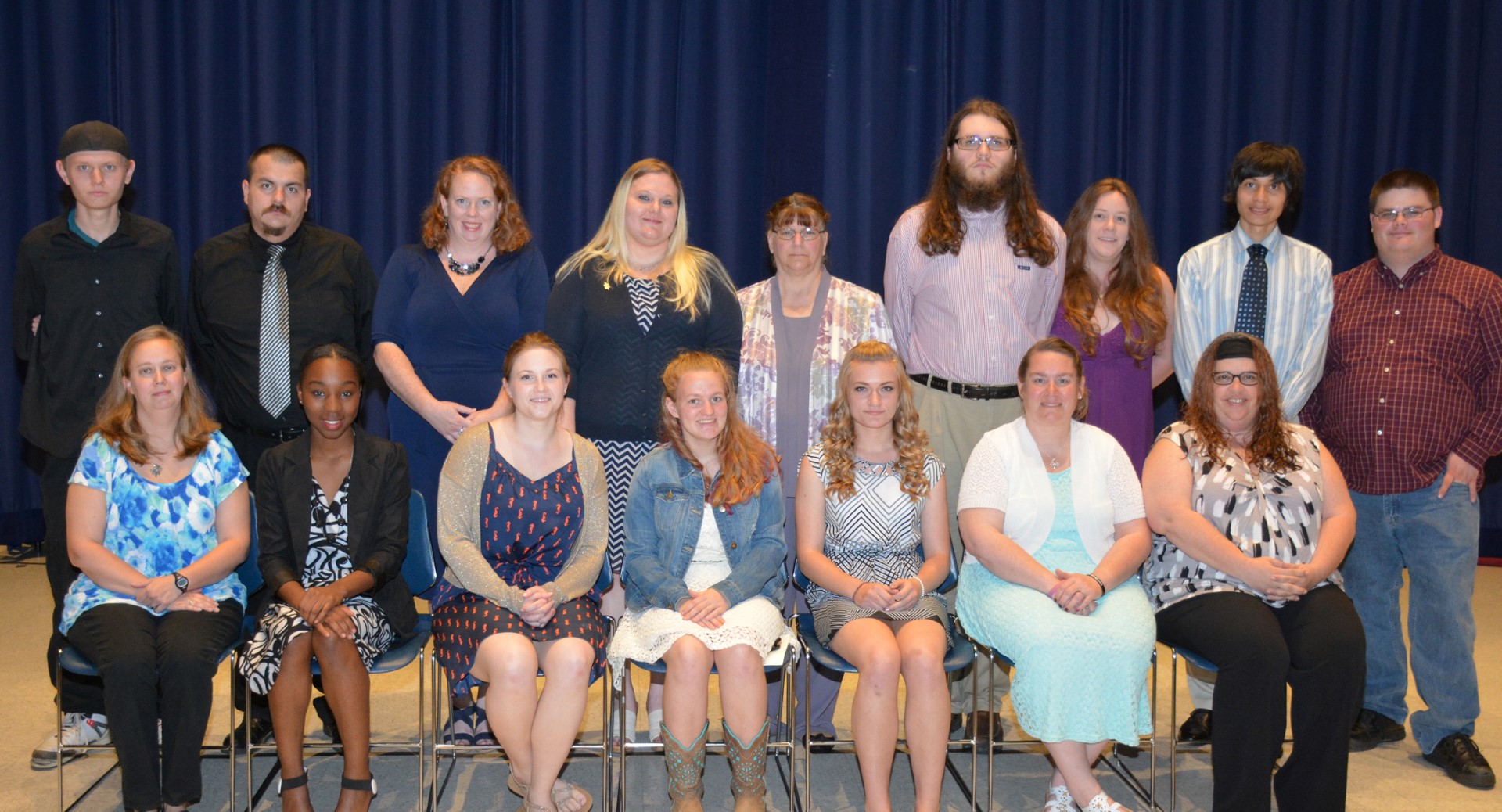 VGCC students from Franklin and Wake counties who were inducted into the Phi Theta Kappa honor society on April 14 included, seated from left: Amy Downing, Keyona Bullock, Heather Henkel, Madeline Osika, Elizabeth Caulfield, Cynthia Black and Jenifer Stearns; standing, from left: Collin Byerley, Robert Chafee, Kathy Conant, Elizabeth Elliott, Nancy Ianniello, Alexander Cockman, Daysha Dawson, Arturo Torrecilla and Joshua Moody. (VGCC Photo)
