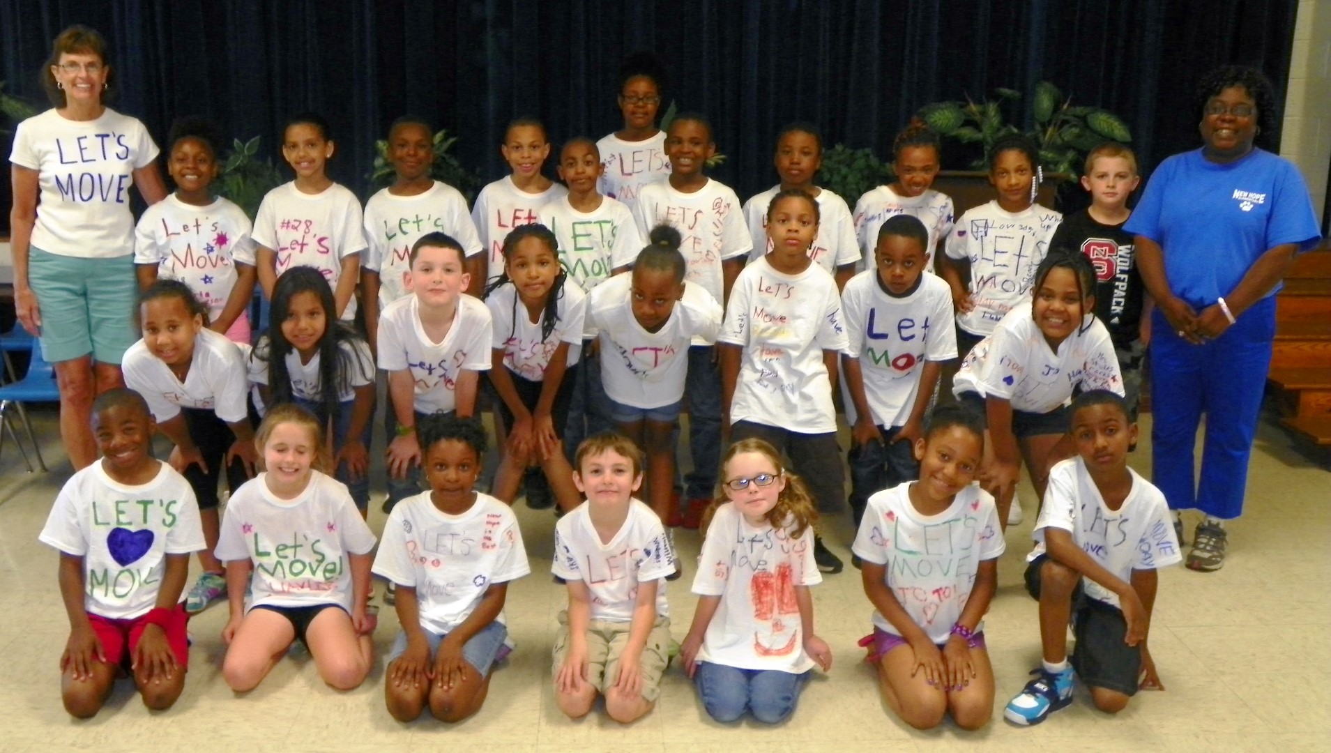 The final accompanying photo shows third-grade students in the classes of Robin Wilson, standing at far left, and Donna Stukes, standing at far right, wearing “Let’s Move” t-shirts they made for the special day.