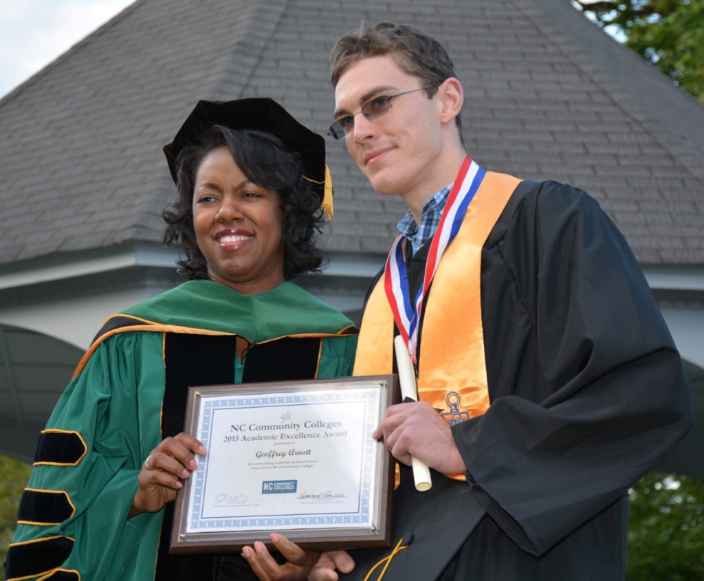 The president recognized one of the graduates, Geoffrey Arnott of Oxford, as the recipient of the N.C. Community College System’s Academic Excellence Award, which he received along with his Associate in Science degree. Arnott is transferring to the University of North Carolina at Chapel Hill this fall. The Academic Excellence Award is presented to one student from each college in the system every year.