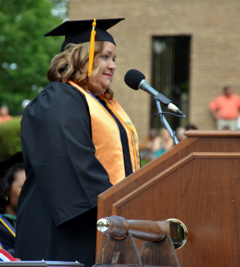 Theresa Chiplis of Norlina, who graduated with a degree in Global Logistics Technology after completing degrees in Accounting and Business Administration last year, spoke on behalf of her classmates. She has served for the past two years as president of the VGCC Student Government Association, among other leadership roles. “By graduating today, we are inspiring others to attend Vance-Granville to start their educational journeys,” Chiplis said to her fellow members of the Class of 2015. To those considering going back to school, she said, “You can do it!”