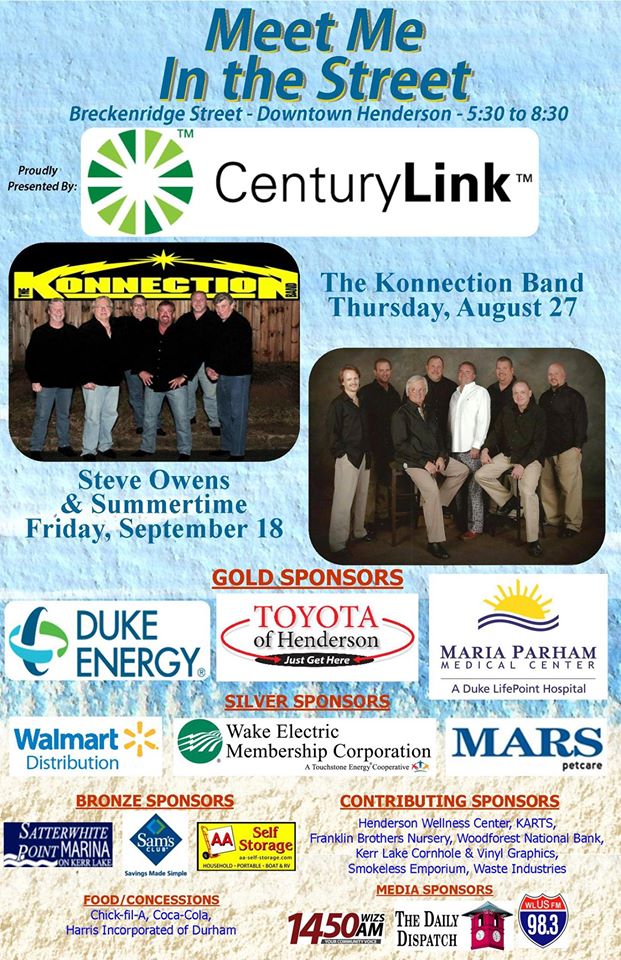 All concerts are free to the public and will be held at the corner of North Garnett and Breckenridge Streets from 5:30 until 8:30 p.m. For more information and for available Sponsorship opportunities, contact Annette Roberson at the Henderson-Vance Chamber at 252-438-8414.