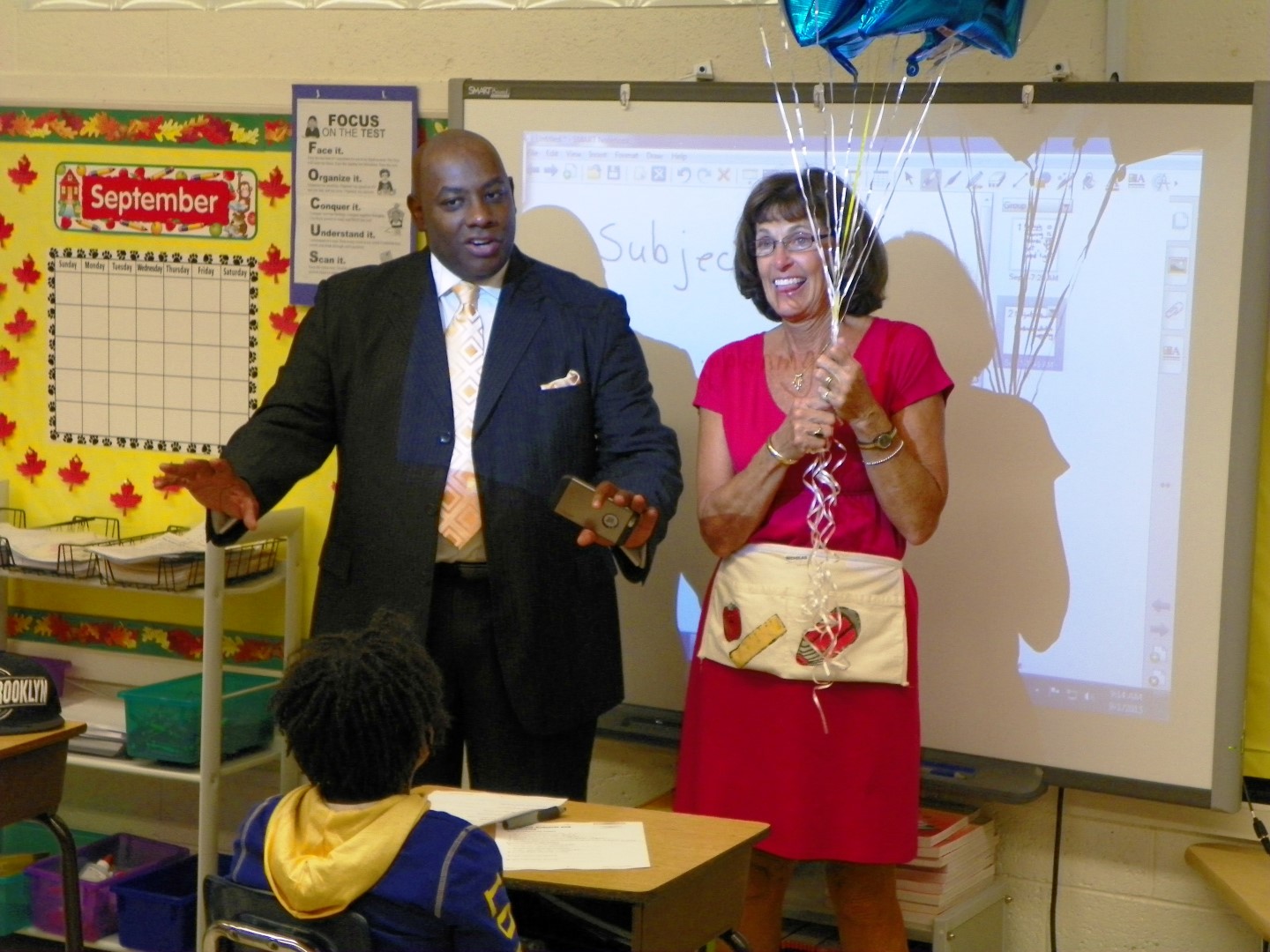 Superintendent Anthony Jackson is shown in the attached photo presenting Mrs. Wilson with balloons this morning and sharing the announcement about her VCS Teacher of the Year award with her third-grade students.