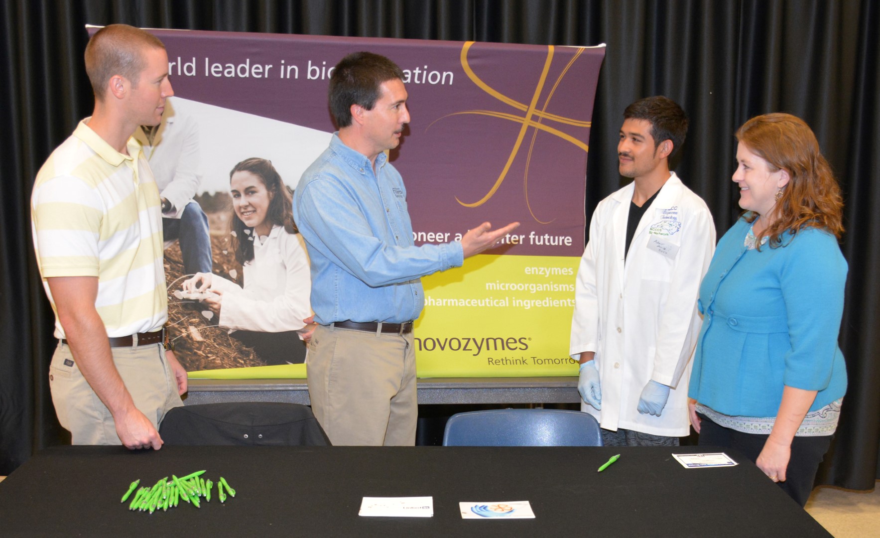 From left, Novozymes fermentation supervisor Jared Wrenn, Novozymes lean engineer Troy Bowen, VGCC Bioprocess Technology student Adair Avila Soria of Louisburg and Bioprocess Technology program head/instructor Dr. Tara Hamilton talk during Advanced Manufacturing Day. (VGCC photo)
