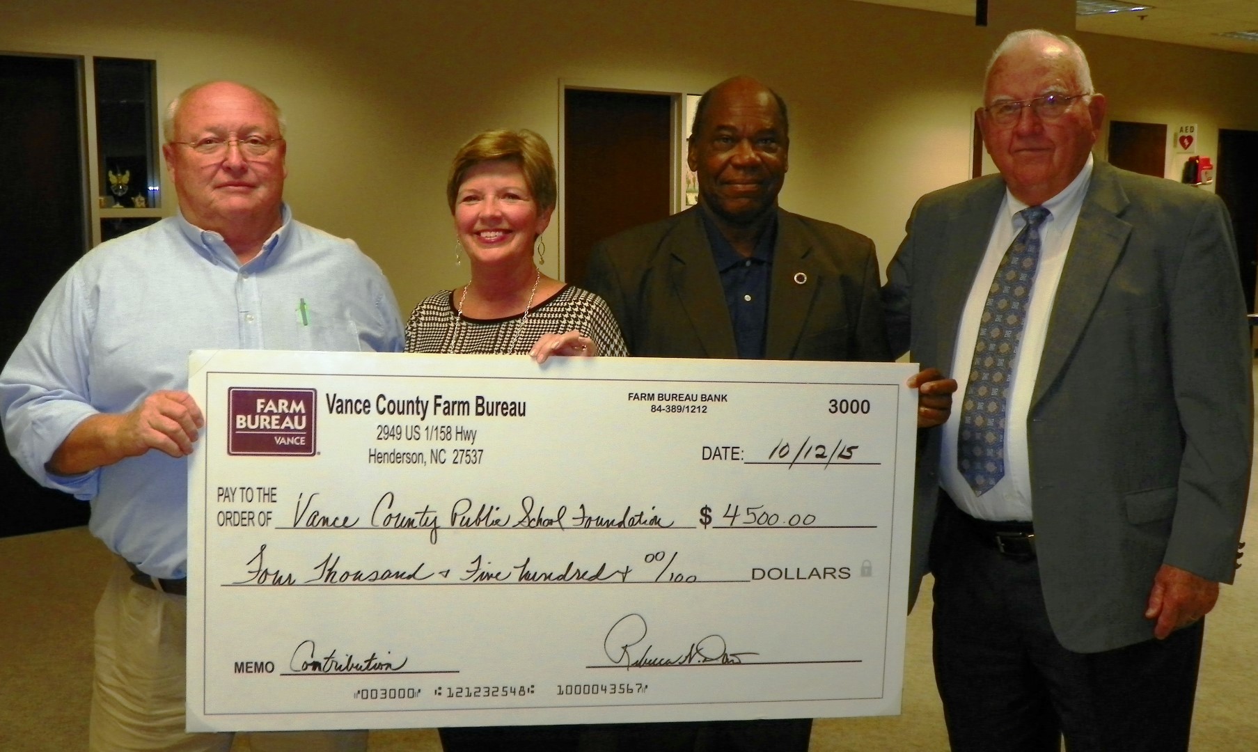 Wilson and Taylor also recognized the outstanding support of the Vance County Farm Bureau, which made a donation of $4,500 in grant monies to fund the “School of the Year” awards. Thomas Shaw and Pete Burgess, both of the Vance County Farm Bureau, attended the meeting on behalf of their organization. They are shown in the second accompanying photo with a giant replica of the grant check. Shown from left are Shaw, Wilson, Taylor and Burgess.