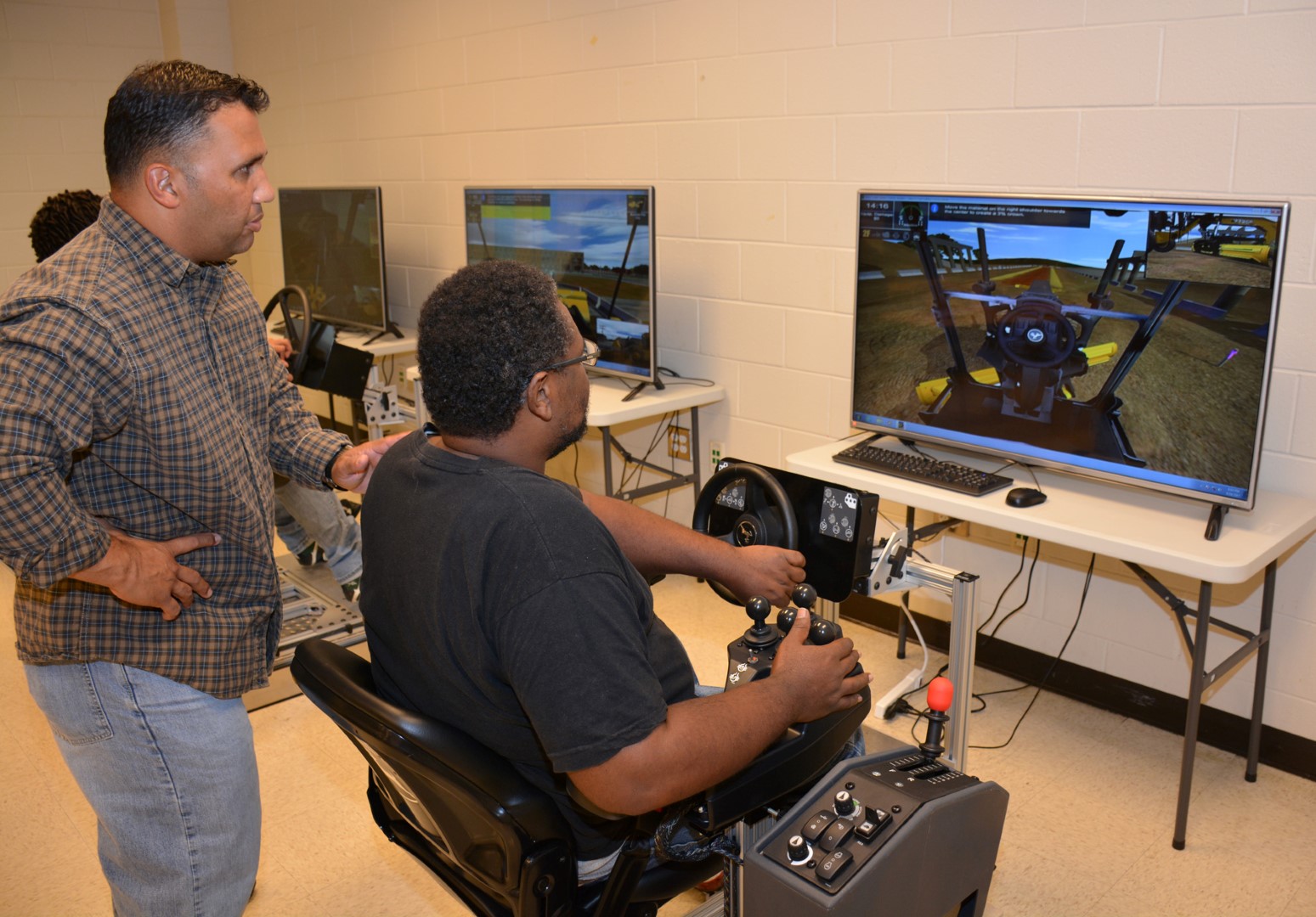 One of the newest programs at Vance-Granville Community College recently received high-tech equipment thanks to grant funding from the North Carolina Department of Transportation. The Heavy Equipment Operator training program, based at the college’s Warren County Campus in Warrenton, now has three computerized training simulators manufactured by John Deere.