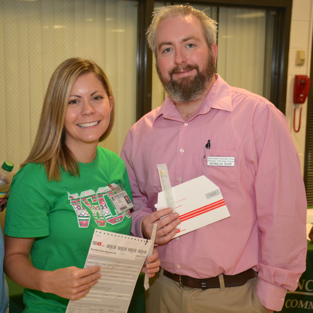 From left, VGCC Associate Degree Nursing student Erica Medlin of Oxford and Radiography student Nick Kemp of Franklinton were among the volunteers coordinating the bone marrow donor registration drive and are seen here holding swabs and registration materials. (VGCC photo)