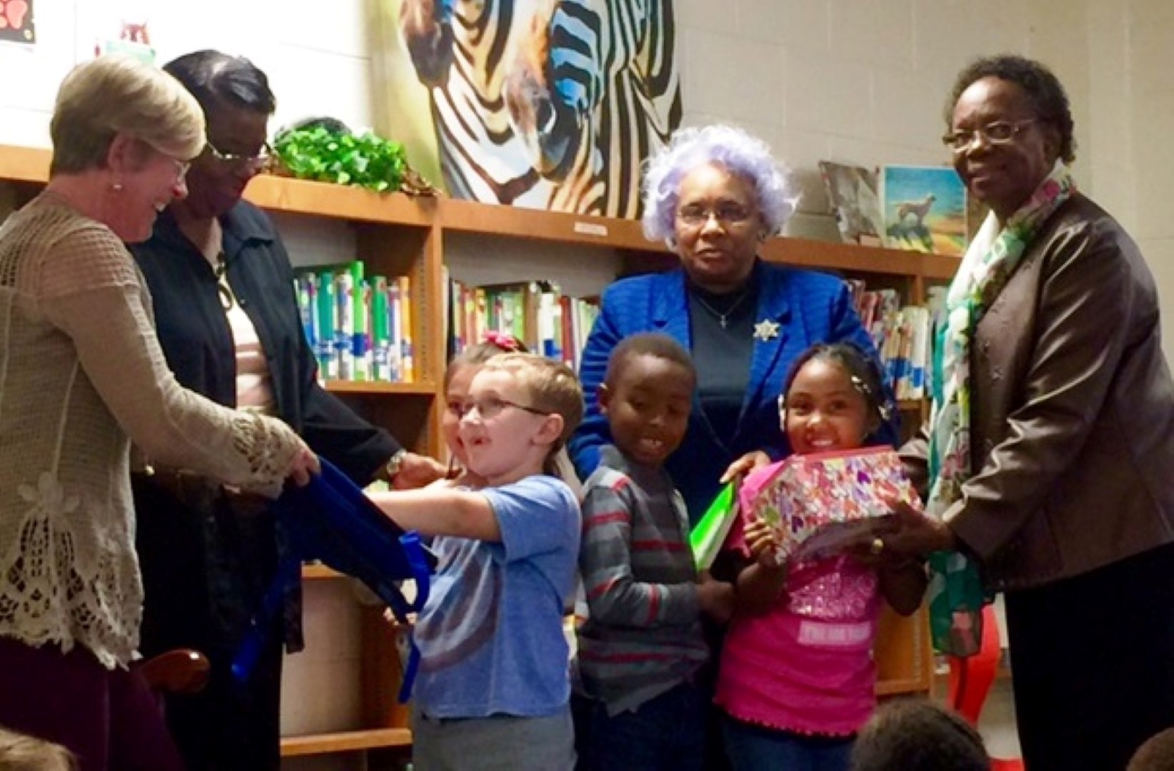 Williams, Bagley and Hendricks are shown in the accompanying photo as they give some of the supplies to students and are assisted by Principal Marylaura McKoon, standing at far left.