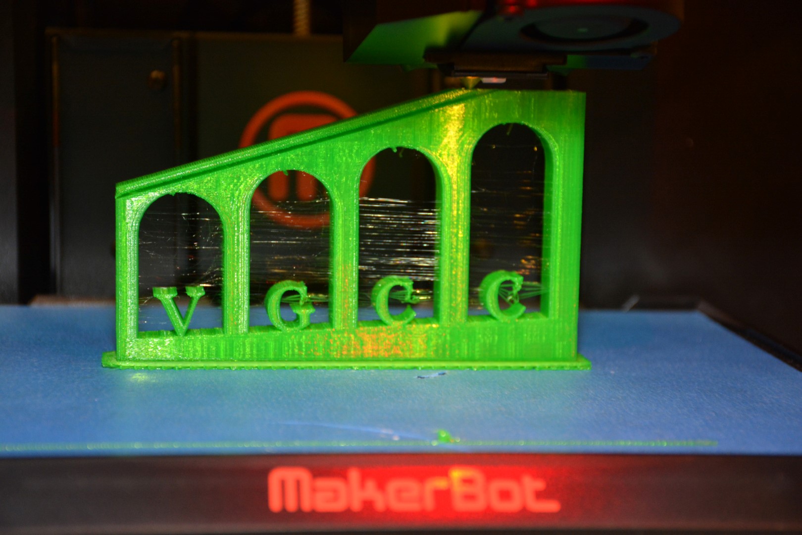 A 3-D printer builds a green model of the VGCC arches logo during the Business Technologies Fair. The model was programmed by Brandon Carver of Durham, a student in the college’s Simulation & Game Development program. (VGCC photo)