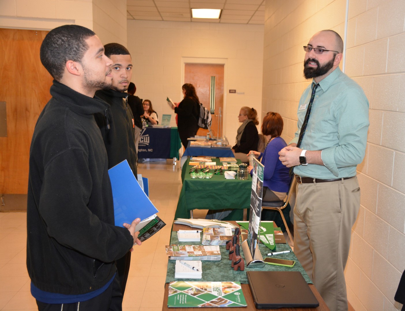 From left, brothers Jeremy Taylor and Justin Taylor of Wake Forest, both students in the VGCC Business Administration program, talk with Steven Lambert of William Peace University during “College Day.” (VGCC photo)